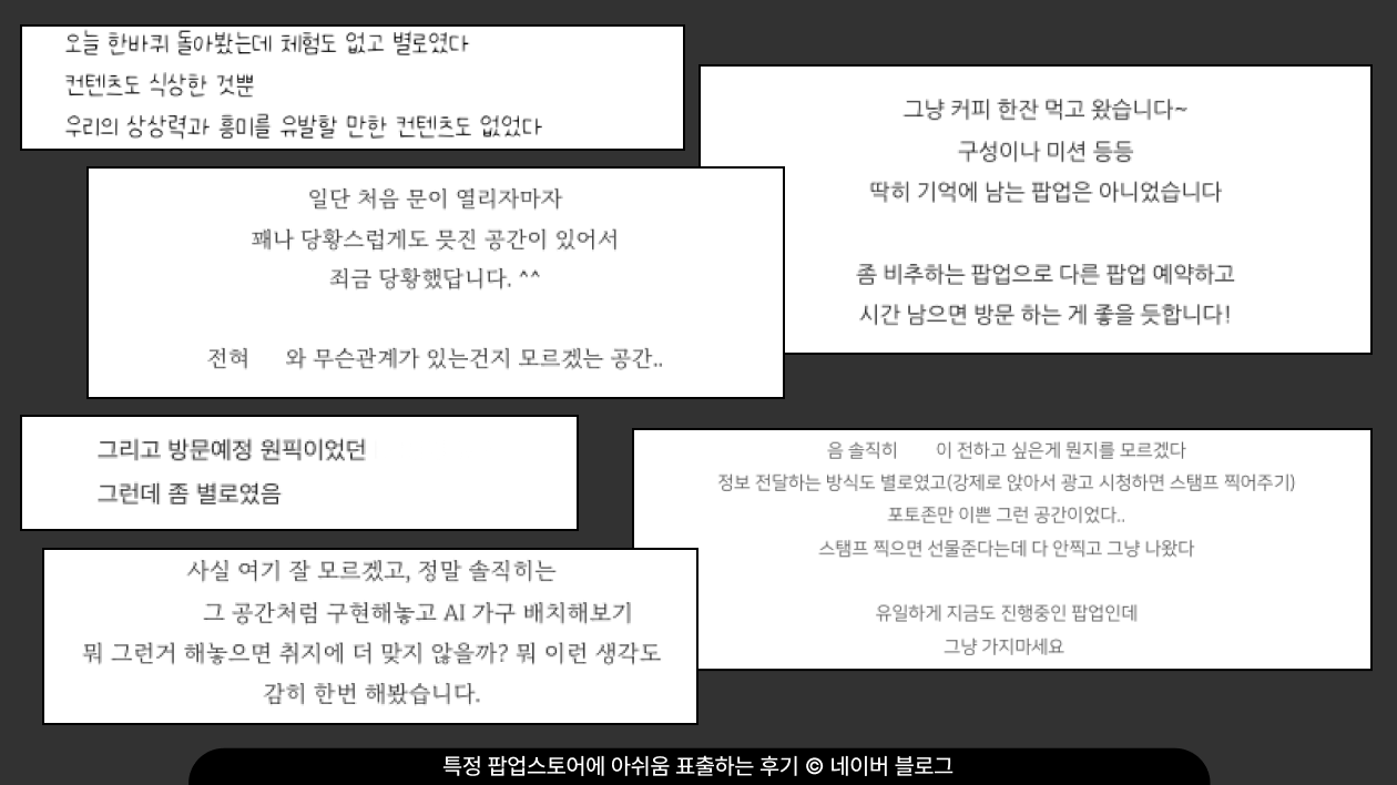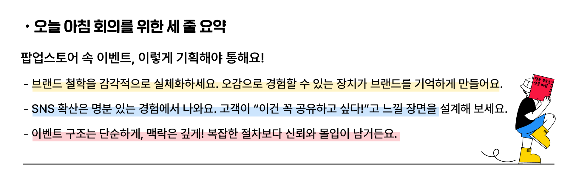 ๊ฒฐ๋ก ๋ถํฐ ๋ง์๋๋ฆฌ์๋ฉด, ์ฒดํ ์์๊ฐ ํต์ฌ์ด์์. ์ค์ผ์ผ์ด ํฌ๊ณ ํ๋ คํ ๊ณต๊ฐ์ด์ด๋, ๊ณ ๊ฐ์ ๊ธฐ์ต์ ๊ฐ์ธ๋ ๋งํ ์ด๋ฒคํธ๋ ์ฒดํ์ด ์๋ค๋ฉด ๊ธ์ธ ํฅ๋ฏธ๊ฐ ๋จ์ด์ง ์๋ฐ์ ์์ด์. ๋ํ ๊ธ์ ์ ์ธ ๋ธ๋๋ ์ธ์์ ์ฌ์ด์ฃผ๊ธฐ๋ ์ด๋ ต๊ณ ์.