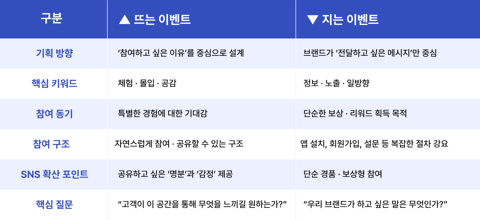 ์คํ ์ด์ ํ๊ธฐ๋ฅผ ์ดํด๋ณด๋ฉด, โ๋ชจ๋ ์ด๋ฒคํธ๊ฐ ๋ธ๋๋์ ๋ฌด์จ ๊ด๊ณ๊ฐ ์๋๊ฑด์ง ๋ชจ๋ฅด๊ฒ ๋คโ, โ๋ฑํ ๊ธฐ์ต์ ๋จ๋ ์ด๋ฒคํธ๋ ์์๋คโ ๋ฑ์ ๋ธ๋๋ ๋ฉ์์ง์ ๋๋จ์ด์ง ์ด๋ฒคํธ์ ๋ํ ์์ฌ์์ ๋ํ๋ด๋ ๋ง๋ค์ด ๋ง์์ด์. ์ฐจ๋ณํ์ ํต์ฌ์ โ๋งฅ๋ฝ'์ด์์. ์ฐธ์ฌ ๊ตฌ์กฐ ์์ฒด๊ฐ ์๋๋ผ, ์ ์ด ์ด๋ฒคํธ๊ฐ ํ์ํ์ง, ๊ทธ ๊ณผ์ ์ด ๋ธ๋๋์ ๋ฉ์์ง์ ์ด๋ป๊ฒ ๋ง๋ฟ์ ์๋์ง๋ฅผ ์ค๊ณํด์ผ ํฉ๋๋ค. ๋งฅ๋ฝ ์์์ ์ค๊ณ๋ ์ฐธ์ฌ๋ ๋ธ๋๋ ์ธ๊ณ๊ด์ ์๋น์์ ๊ฒฝํ ์์ ์์ฐ์ค๋ฝ๊ฒ ์ฌ์ด์ฃผ๊ฑฐ๋ ์. |