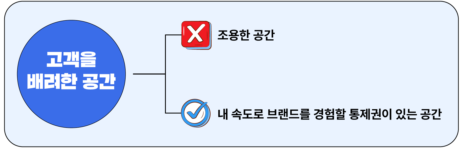 ํ๊ณ ๊ตฌ๋งค๊น์ง ์ด์ด์ง๊ฑฐ๋ ์. ๊ณ ๊ฐ์ ๋ฐฐ๋ คํ๋ค๋ ๊ฑด ๋จ์ํ ์กฐ์ฉํ๊ธฐ๋ง ํ ๊ณต๊ฐ์ ๋ง๋๋ ๊ฒ ์๋๋ผ๋ ์ ์ด์์. ํ์ธ์ ์์ ์ด๋ ๊ฐ์ ์์ด, ๋ด ์๋๋ก ๋ธ๋๋๋ฅผ ๊ฒฝํํ ์ ์๋ ํต์ ๊ถ์ ๊ณ ๊ฐ์๊ฒ ์ฃผ๋ ๊ฒ์ด ์ค์ํ์ฃ .