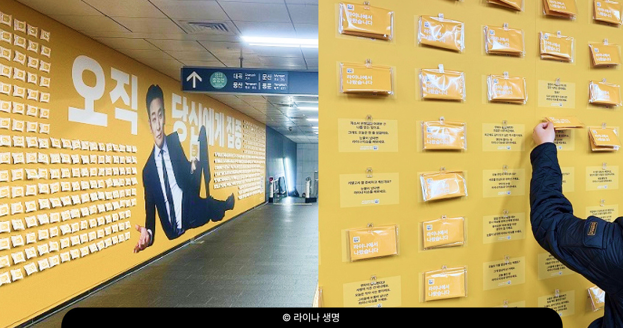 옥외광고는 매체 특성상 노출에 방점을 두고 기획하는 경우가 많잖아요. 하지만 라이나생명은 지난 11월 조금 다른 방식으로 메시지를 전달했어요. 홍대입구역에 1,500개의 티슈를 붙이고 지나가는 사람들이 하나씩 떼어갈 수 있도록 한 건데요. 티슈 뒤에는 공감과 유머를 담은 30여 개의 메시지가 적혀 있어 참여한 사람들에게 뜻밖의 웃음과 위로를 선물했죠.