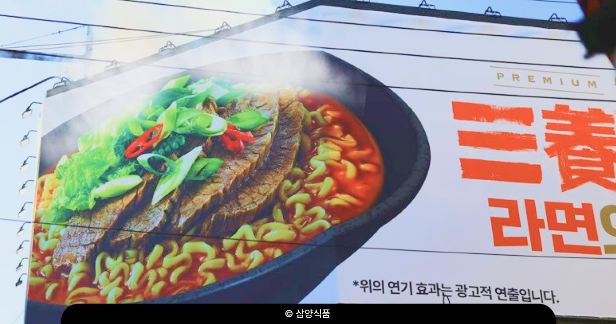 옥외광고는 평면의 광고판 안에서만 아이디어를 표현해야 한다는 한계가 있어요. 그런데 얼마 전 삼양이 신제품 옥외광고에 간단한 장치 하나를 추가하는 방법으로 이 한계를 극복해 이슈가 됐어요.