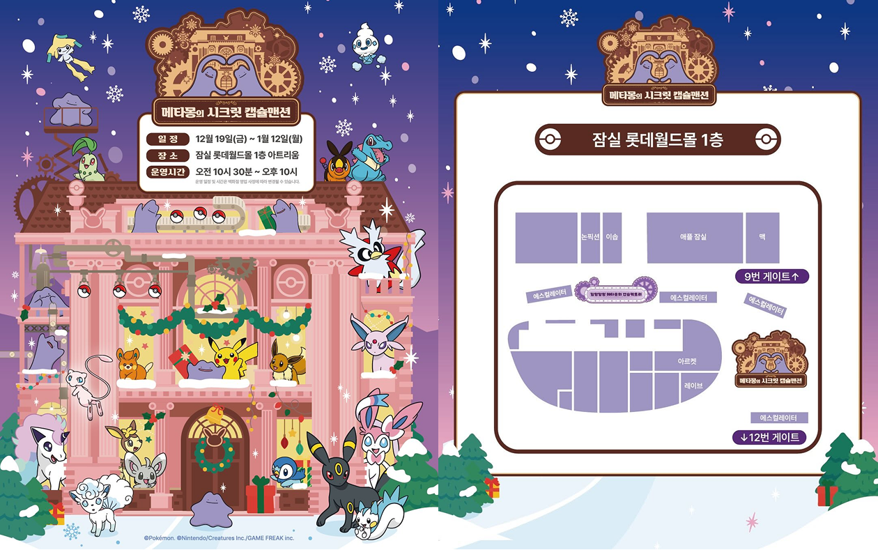 롯데월드몰 곳곳에 메타몽 100마리가 등장했던 포켓몬 타운 2025 팝업스토어, 기억하시나요? 연말을 맞아 메타몽이 다시 한번 잠실에 돌아왔어요. 선물 공장을 콘셉트로 한 이번 팝업스토어는 약 100평 규모 공간에서 총 180여 종의 상품을 선보이며, 카카오 이모티콘과 협업한 굿즈부터 2026년 캘린더까지 홀리데이 한정 상품으로 가득 채워졌어요. 또한 롯데백화점 잠실점 본관 지하 1층에서는 ‘포켓몬 카드샵 in 잠실’까지 함께 운영하며 즐길 거리를 풍성하게 더했죠.